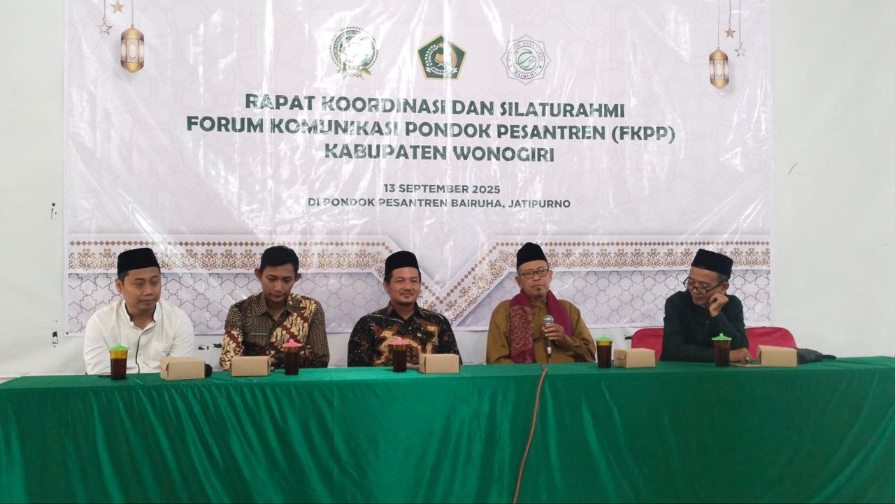 Wonogiri (26/11). Forum Komunikasi Pondok Pesantren (FKPP) Kabupaten Wonogiri mengadakan rapat koordinasi dan silaturahmi di Pondok Pesantren Bairuha, Jatipurno, pada Sabtu, (13/09). Kegiatan ini dihadiri pimpinan dan perwakilan pondok pesantren se-Wonogiri untuk mempererat hubungan antar-pesantren dan mempersiapkan agenda bersama, termasuk peringatan Hari Santri Nasional.