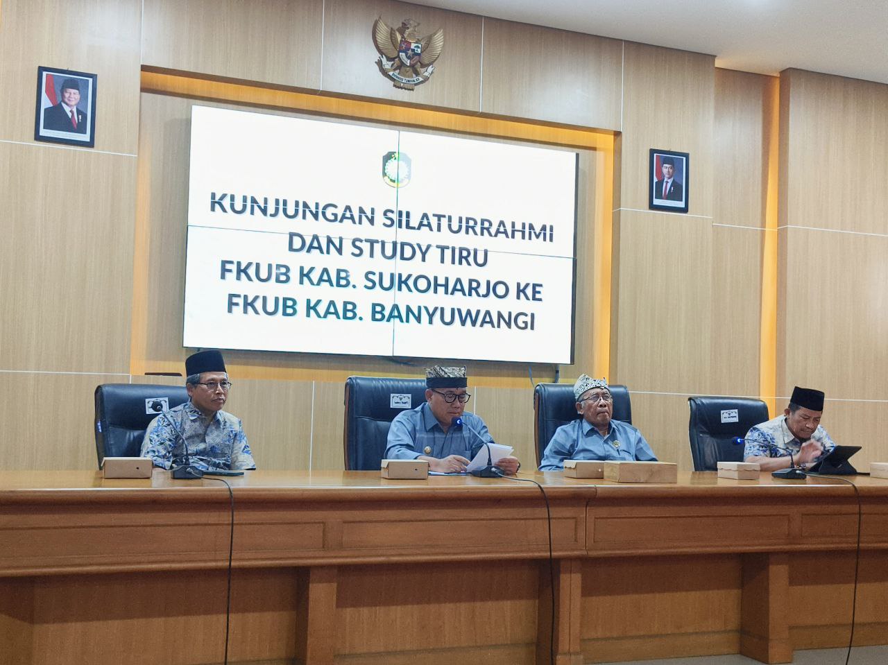 Banyuwangi (23/11). Forum Kerukunan Umat Beragama (FKUB) Kabupaten Sukoharjo mengunjungi FKUB Kabupaten Banyuwangi untuk silaturahmi dan studi tiru pada Jumat (19/9/2025). Pertemuan berlangsung di Ruang Rapat Minak Jinggo, Kantor Pemerintah Kabupaten (Pemkab) Banyuwangi.