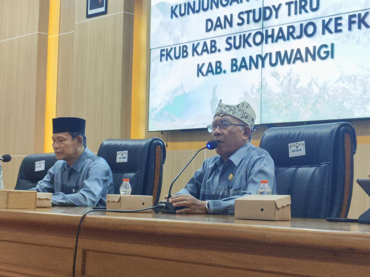 Ketua FKUB Sukoharjo Dr. Zainul Anas, menyampaikan terima kasih atas sambutan Pemkab Banyuwangi. Ia menjelaskan, maksud kunjungan ini adalah untuk menjalin silaturahmi sekaligus belajar dari pengalaman FKUB Banyuwangi yang dinilai berhasil dalam pembinaan kerukunan antarumat beragama. “Program FKUB Banyuwangi, seperti Fila, Formula Satu, dan KG Lima, sangat inspiratif dan bisa dicontoh daerah lain,” ujarnya.